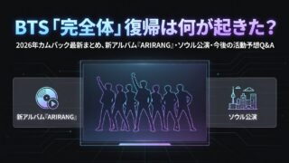 未分類 BTS「完全体」復帰は何が起きた?2026年カムバック最新まとめ|新アルバム『ARIRANG』・ソウル公演・今後の活動予想Q&A